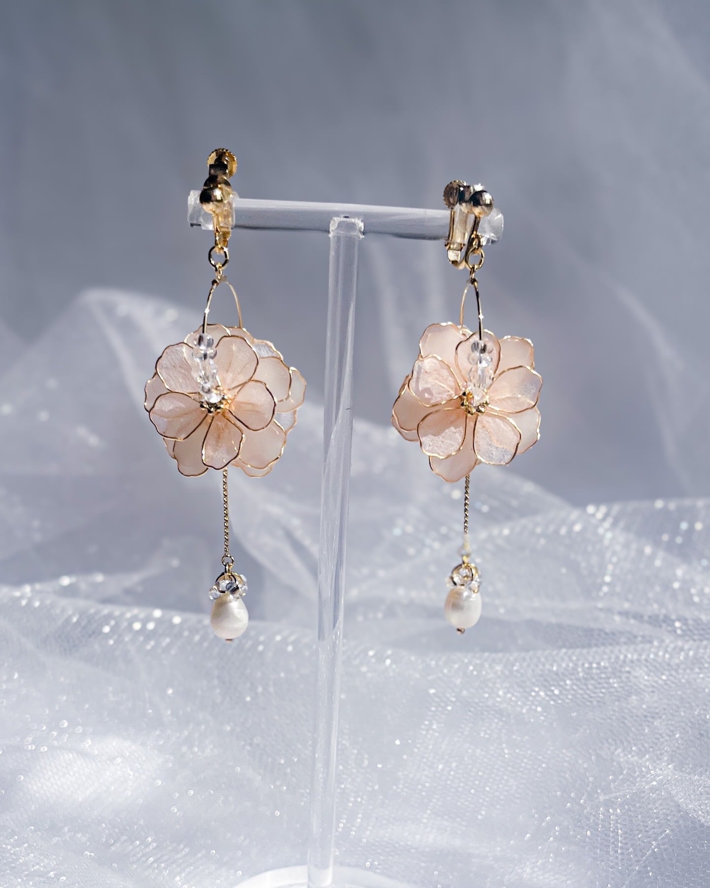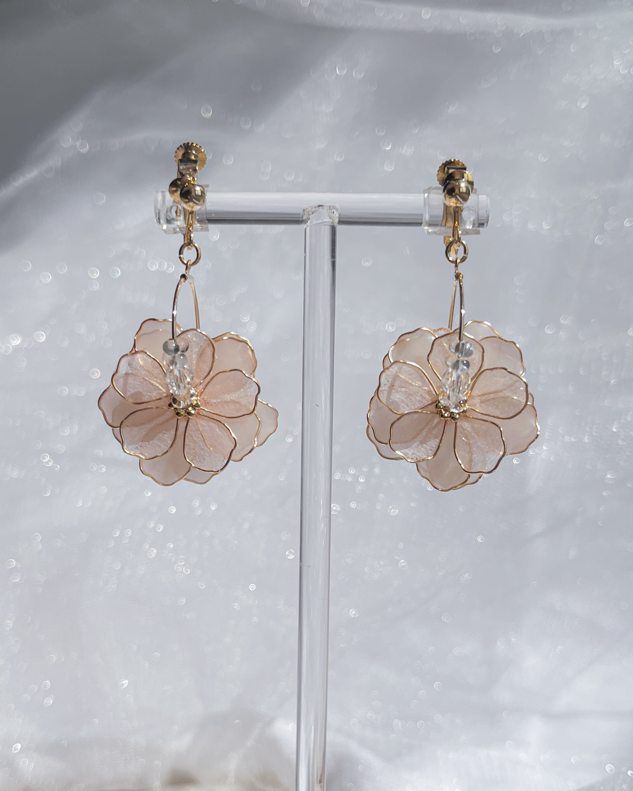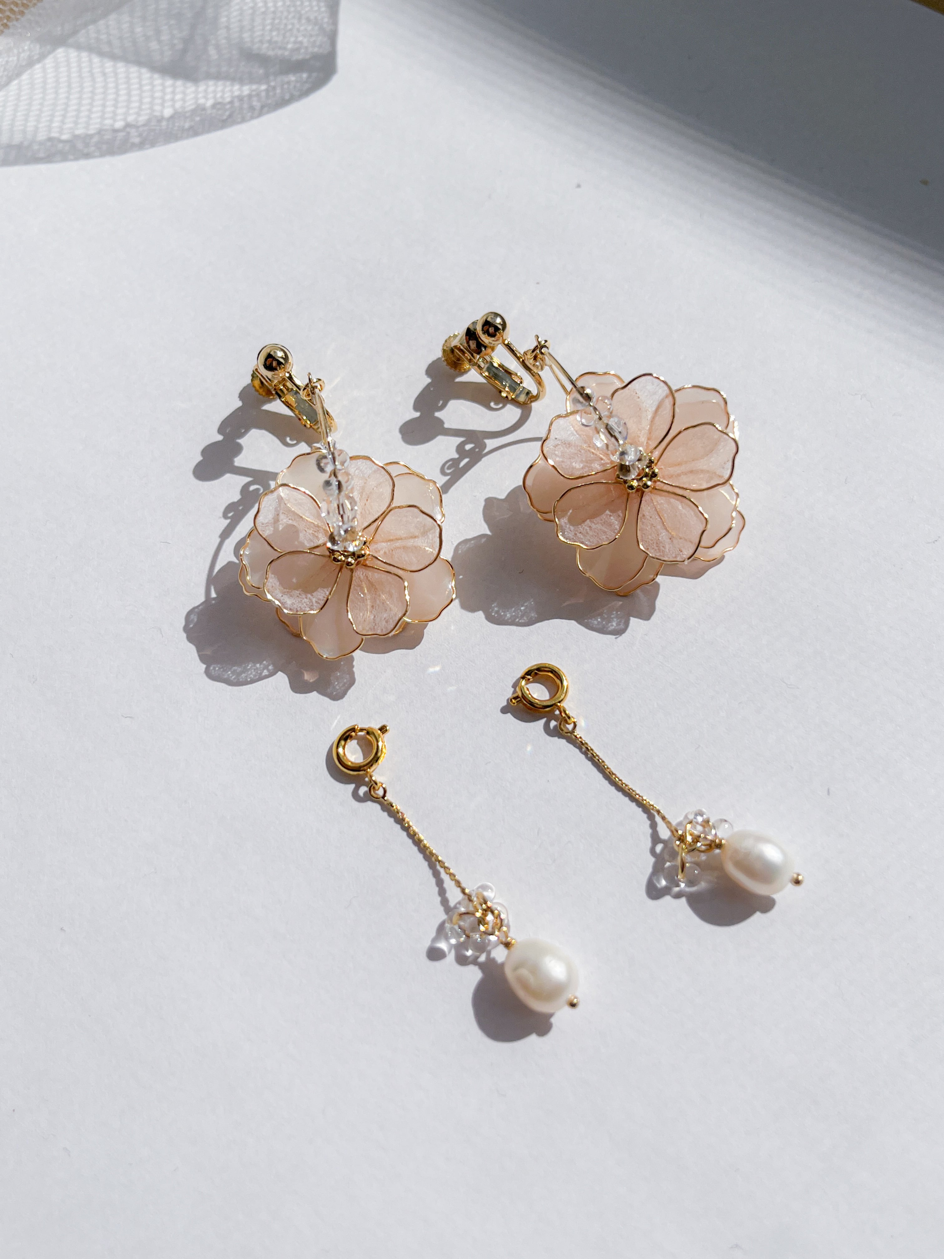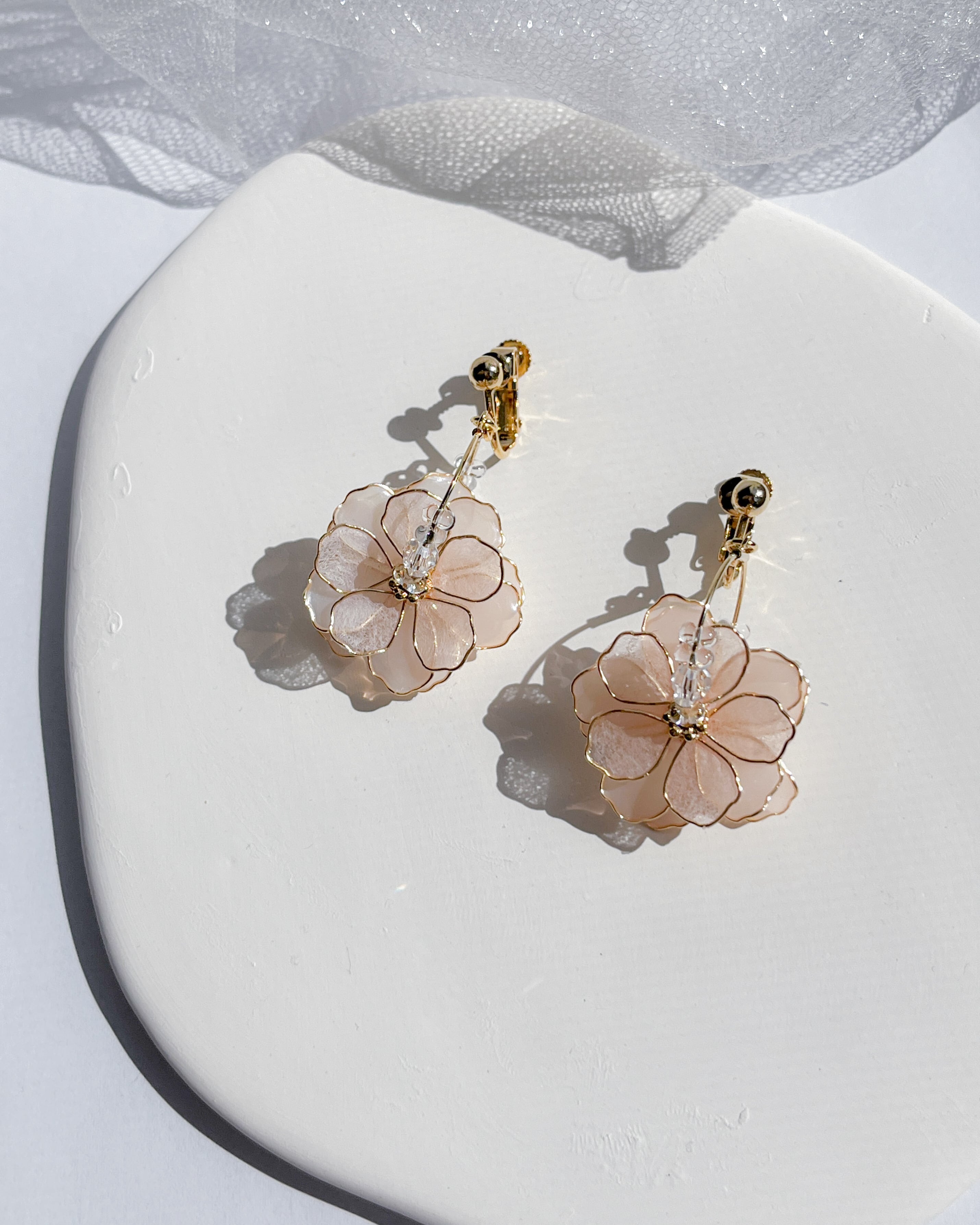 “満開"にを連想するようなボリュームのある和紙やレジンいろんな質感を合わせてアクササリー